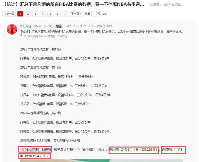 有球迷统计了曾凡博从2023年到现在打国家队比赛的数据,他一共打了3场世预赛+4场亚预赛,总共7场FIBA亚洲比赛,场均6分3篮板1.28盖帽,投篮总计41投14中(命中率34.14%),三分总计24投5中(命中率20.83%),罚球总计14罚9中(命中率64.28%)这样的数据真是太一般了,不知他哪来的底气天天想着去NBA打球,怪不得蓝网NBA中国赛不让他上场。