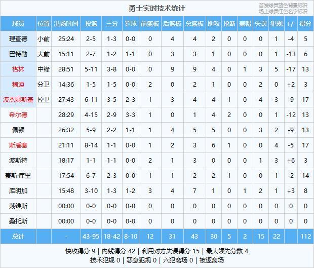 波杰姆斯基17分4板4助、斯潘塞17分3板6助、赛斯·库里14分2板2助、格林13分9板4助、佩顿13分5板5助、希尔德13分1板4助2断、库明加8分7板1助、巴特勒6分3板1助、理查德5分4板2助、波斯特3分3板、穆迪3分2板1助