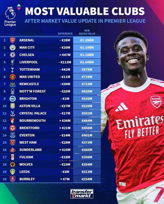 北京时间12月10日,在更新了英超球员的身价之后,德转列出了此次更新后英超20家俱乐部一线队球员总身价的排名,阿森纳此次全队身价下跌2800万欧元,但仍以12.9亿欧元高居第一,曼城全队下跌2000万欧元,以11.9亿欧元排名第二,切尔西上涨4700万欧元,以11.8亿欧元排名第三,利物浦全队的跌幅则高达1.12亿欧元,以10.4亿欧元排名第四。